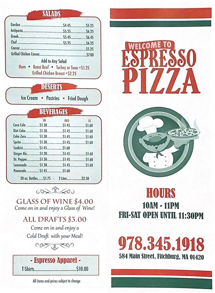 Introducing Espresso Pizza in Fitchburg, a casual yet classy pizza spot that offers a unique dining experience. Located at 584 Main St, Fitchburg, MA, Espresso Pizza is known for its wide variety of pizzas, including favorites like Greek, Hawaiian, and Taco. The menu also features refreshing salads such as Antipasto and Caesar, as well as beverages like 2-liter sodas and 20 oz. sodas. Customers rave about the fresh ingredients, generous portions, and reasonable prices. Whether you are a longtime fan or a newcomer, Espresso Pizza promises consistency and quality in every bite. Don't miss out on trying their signature pies and see why this place is a go-to for pizza lovers in Fitchburg.